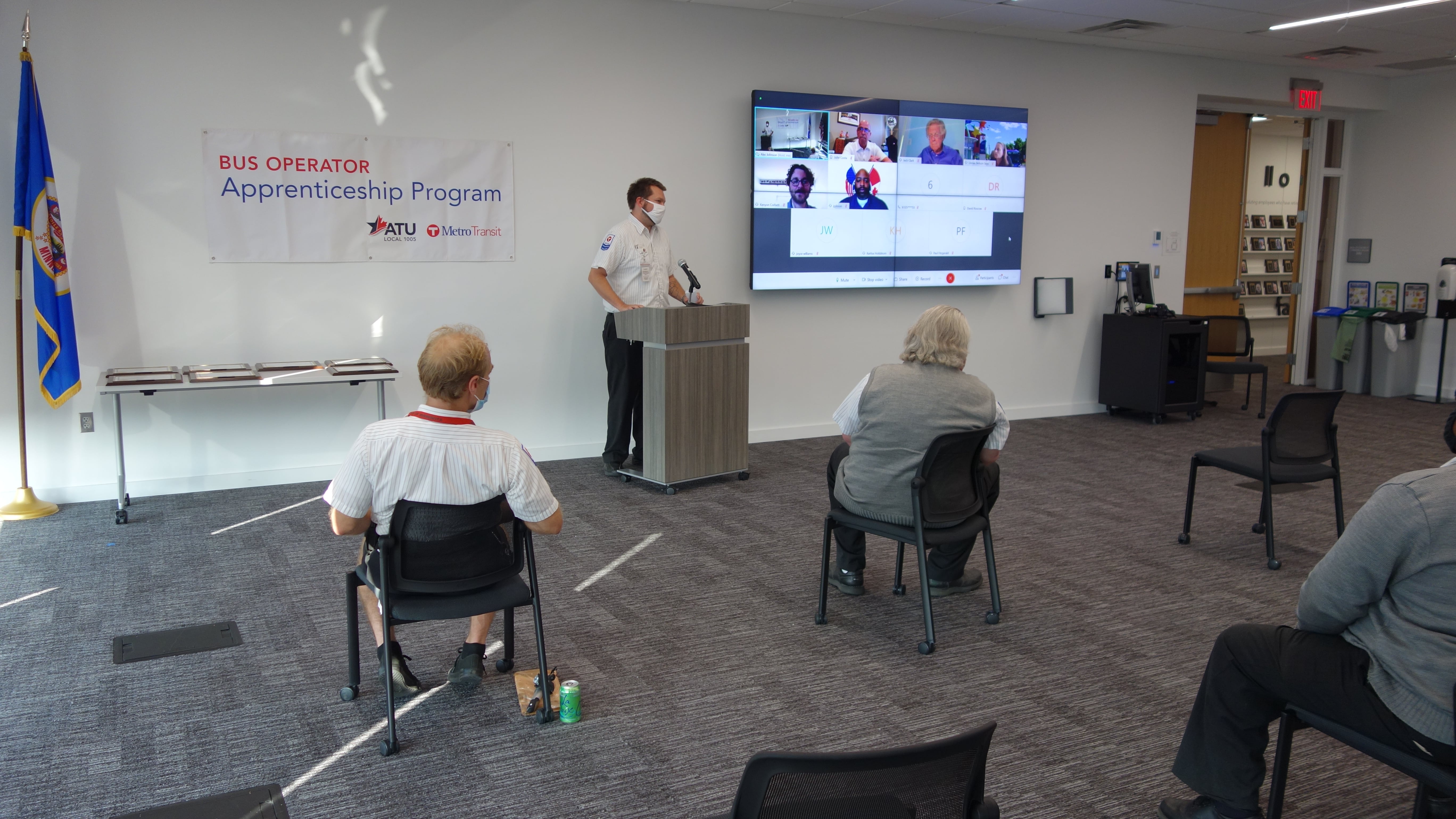 At the first of four socially distant ceremonies, 15 bus operators received their journeyworker certificate issued by the Minnesota Department of Labor and Industry.