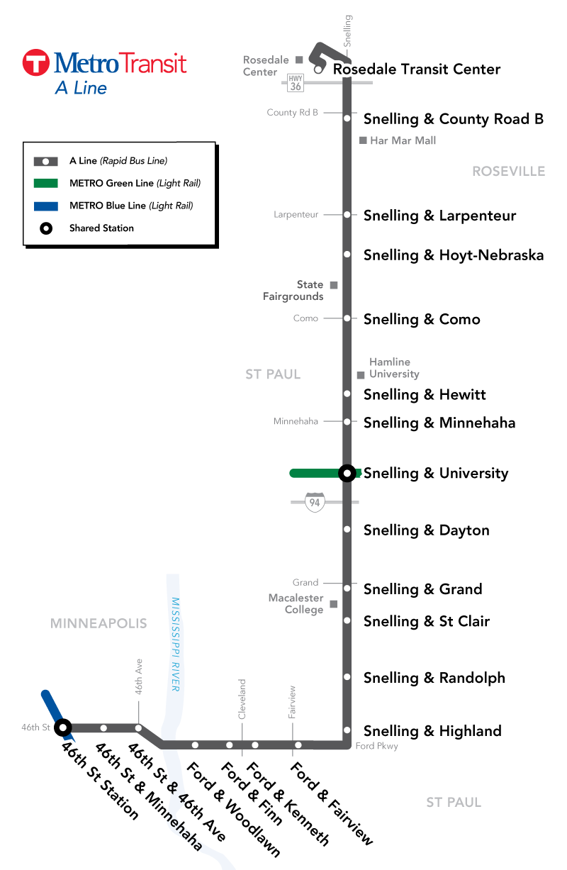 The first of a dozen rapid bus lines to be built by Metro Transit throughout the region, the A Line runs from Rosedale Center in Roseville, down Snelling Avenue through Falcon Heights and St. Paul, to Ford Parkway, where it crosses the Mississippi River into Minneapolis on 46th Street. The A Line connects to the METRO Green Line's Snelling Avenue Station in St. Paul and to the METRO Blue Line's 46th Street Station in Minneapolis.