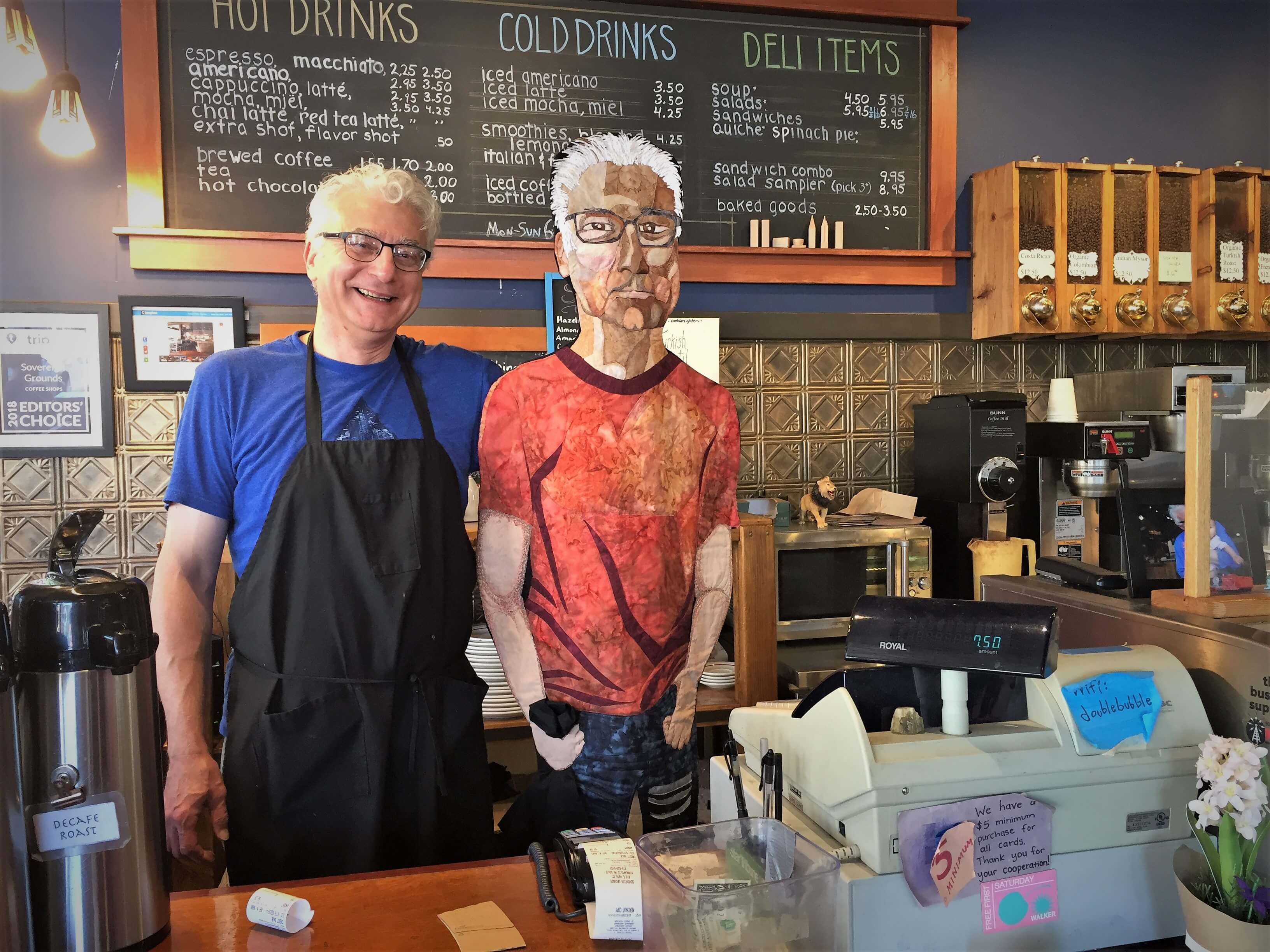 Hakan holds his quilted likeness behind the counter of his coffee shop at 48th and Chicago.