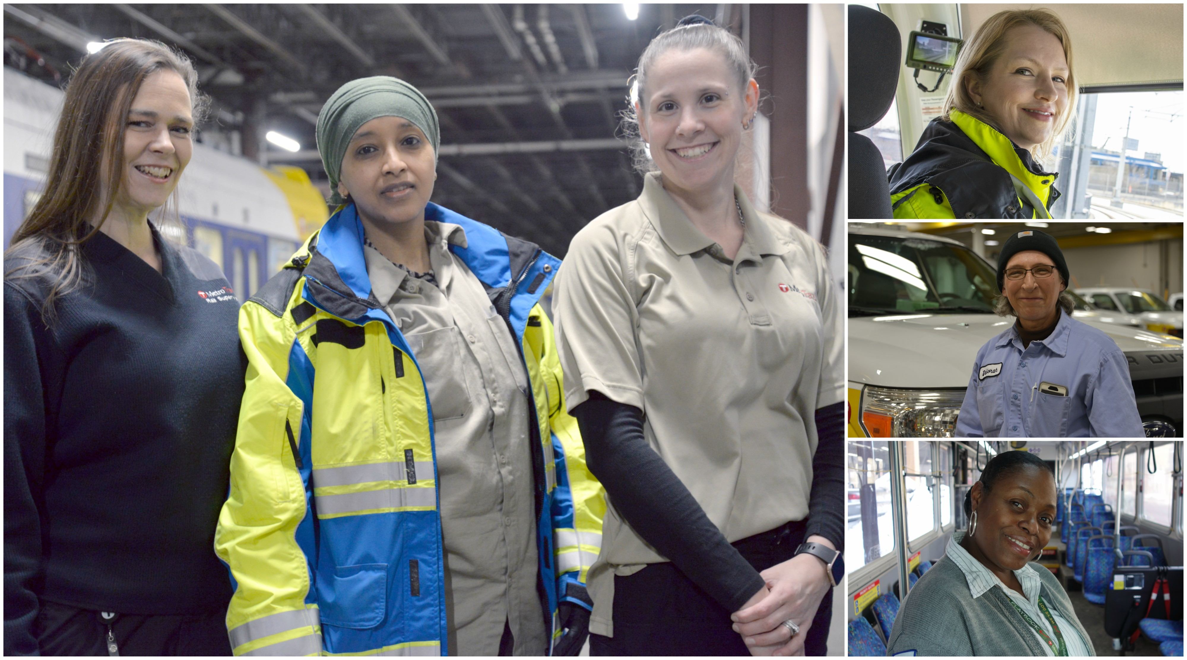Clockwise from top left: Rail Supervisor Carri Sampson-Spande, LRT Helper Aida Mohamed, and Jennifer Schultz, on assignment as a Rail Supervisor as part of a career development program, Train Operator Beth DeSalguero, Public Facilities Worker Deb Hamilton and Bus Operator Tamica Washington.