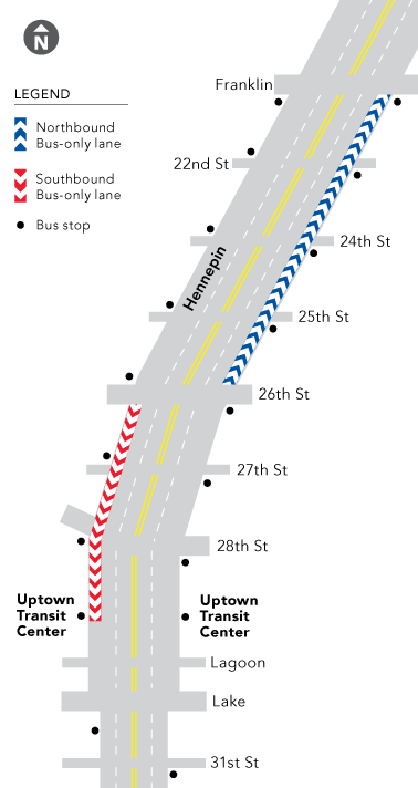 A northbound bus-only travel lane will be created by restricting street parking on the east side of Hennepin Avenue between 26th Street and Franklin Avenue each morning from 6 a.m. to 10 a.m. A southbound bus-only travel lane will be created by restricting parking on the west side of Hennepin Avenue between 26th Street and the Uptown Transit Center each evening from 3 p.m. to 7:30 p.m.