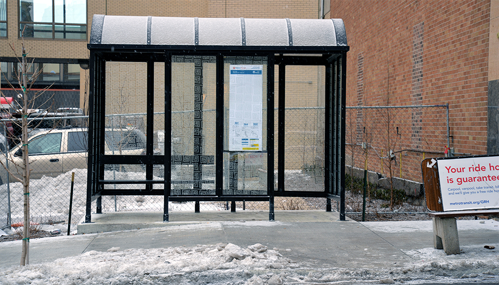 The developer, St. Paul-based Real Estate Equities, allowed Metro Transit to place the shelter on private property and incorporated its design into the redevelopment project. The sidewalk was also widened.