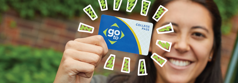 To pay your fare when you ride the bus or train, simply touch your College Pass to the Go-To logo on the reader next to the farebox or on station platforms. The reader will then display “Go” or “Transfer.”