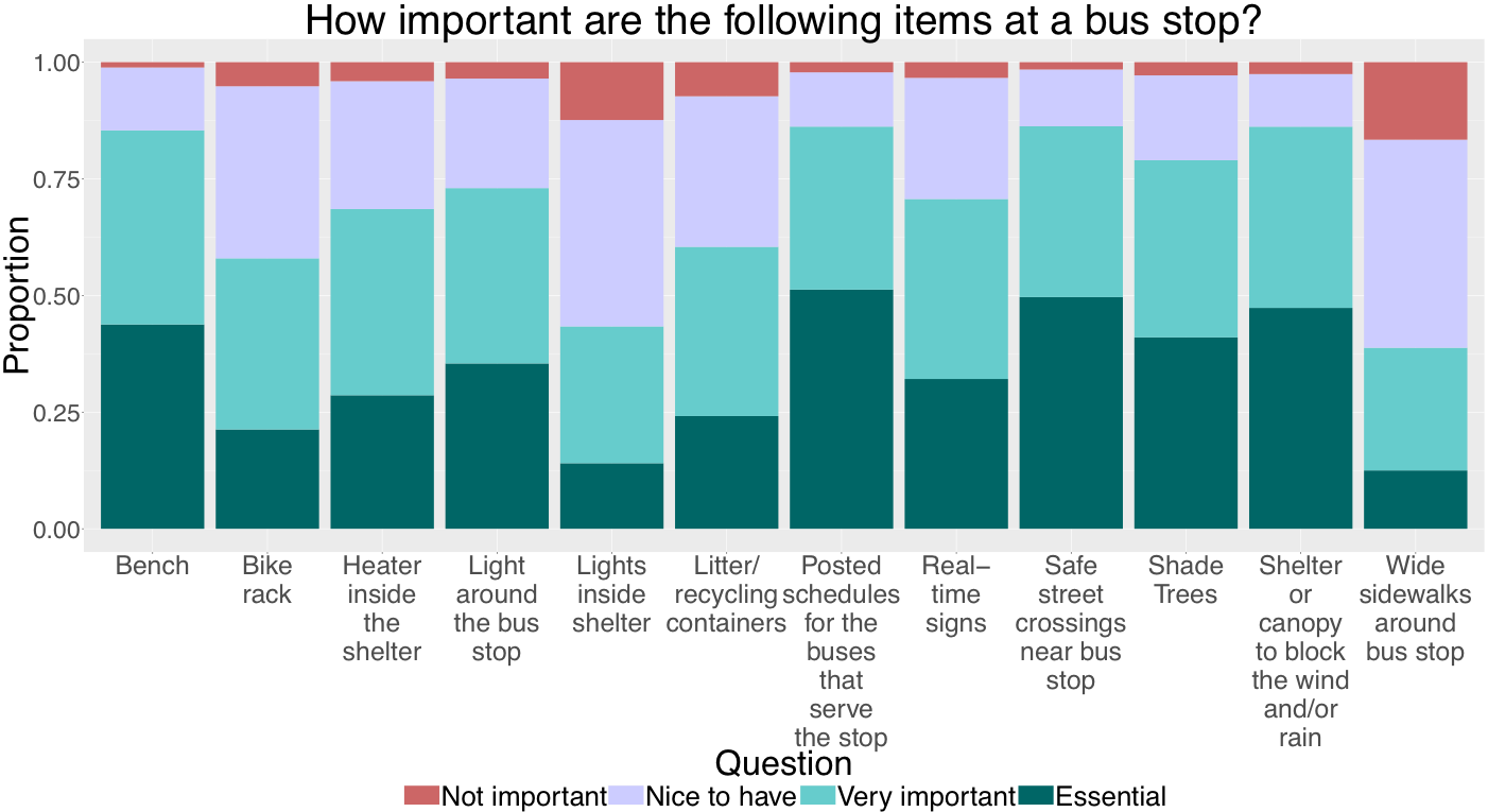 I’ve also analyzed survey data that asks Metro Transit customers what features are important to have at a bus stop, and where the agency should prioritize placing shelters. The plot below shows the how important participants felt each of the features were to have at a bus stop. The dark and light green colors represent the proportion of people who felt a particular feature was essential or very important, whereas the purple and red indicate the proportion of people who thought that feature was just nice to have or not important. We can see that the benches, posted schedules, safe street crossings, and shelters had the highest proportion of people indicating they were essential or very important. Lights inside the shelter and wide sidewalks were marked as not important most frequently.