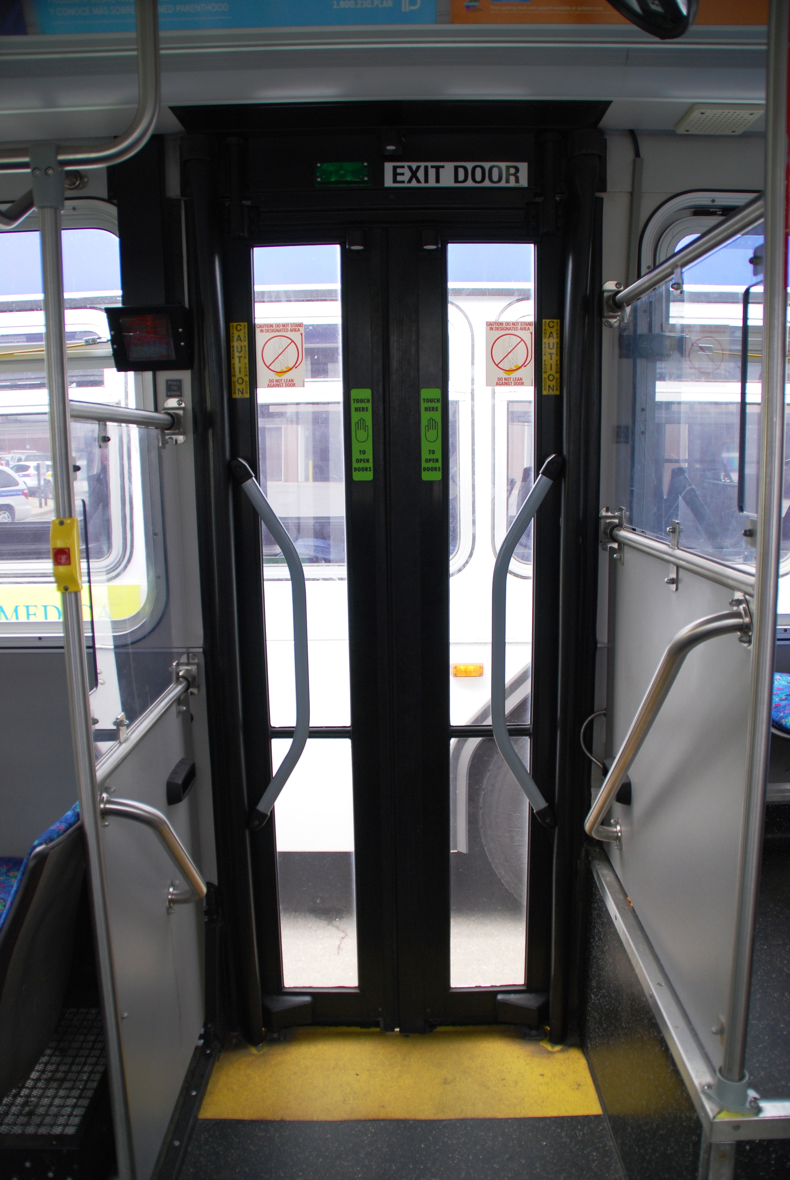 When unlocked, customers using the back exit can open the doors by placing their hands on or near the "touch here" stickers. On newer buses, the doors will automatically open when motion is detected -- the doors do not need to be physically pushed. Older buses use an air-pressure system that is engaged when a customer presses on the door handles.