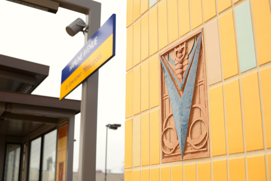 Public art: Minneapolis artist Foster Willey and his brother Guy combined Terra Cotta, hand-made glazed tiles and other materials to create what they call “Hamline Prairie Station.” The work is inspired by Prairie School Architecture, a popular Midwestern style that draws on the natural environment. “I have always been drawn to the combination of geometric and organic forms that define the Prairie style,” Foster Willey said. “The station provides a modern context for new designs that are both original and complimentary.
