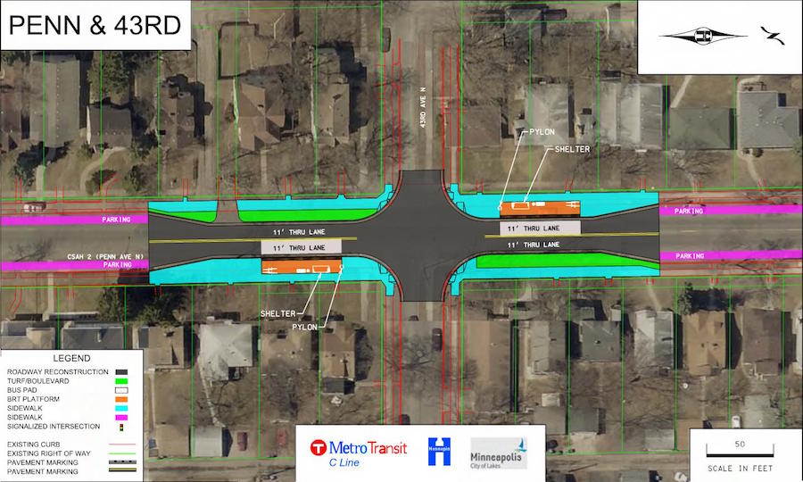 The METRO Orange Line will serve the existing I-35W & 46th Street Station located in the center of the freeway. The station opened in 2010 as part of the Crosstown project and provides connections to local bus routes 11 and 46. The Orange Line project will update signage and ticket machines in the station.