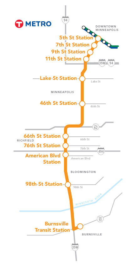 New, enhanced stations will be built at Lake Street, 66th Street, 76th Street, American Boulevard and 98th Street. There will also be service to the Burnsville Transit Station area. Each new station will include amenities like on-demand heat, ticket vending machines, real-time transit information and security features.