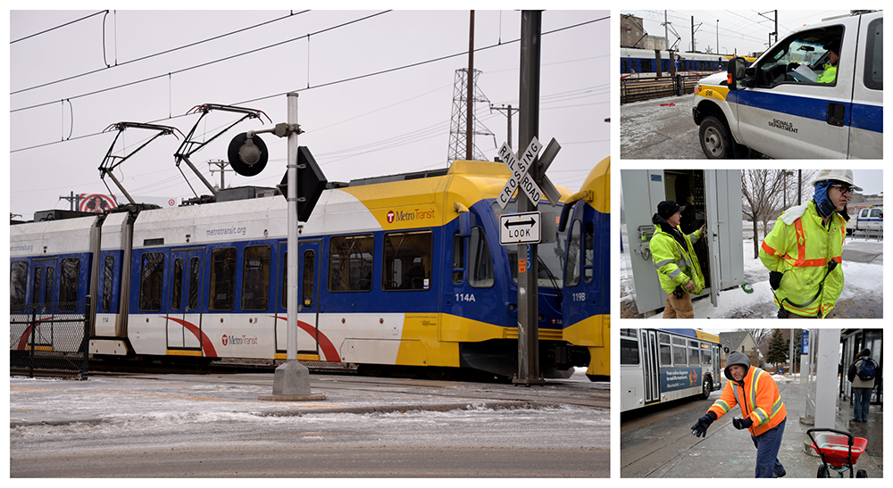 Above: A Blue Line train equipped with special ice-cutting pantographs (the equipment between the train and overhead wire) enters the 46th Street Station; Signals Foreperson Mike Miller and Signals Technician Terry Chacos monitor a crossing guard; Lead Public Facility Worker Andrew Gonzalez puts salt down at the 46th Street Station.