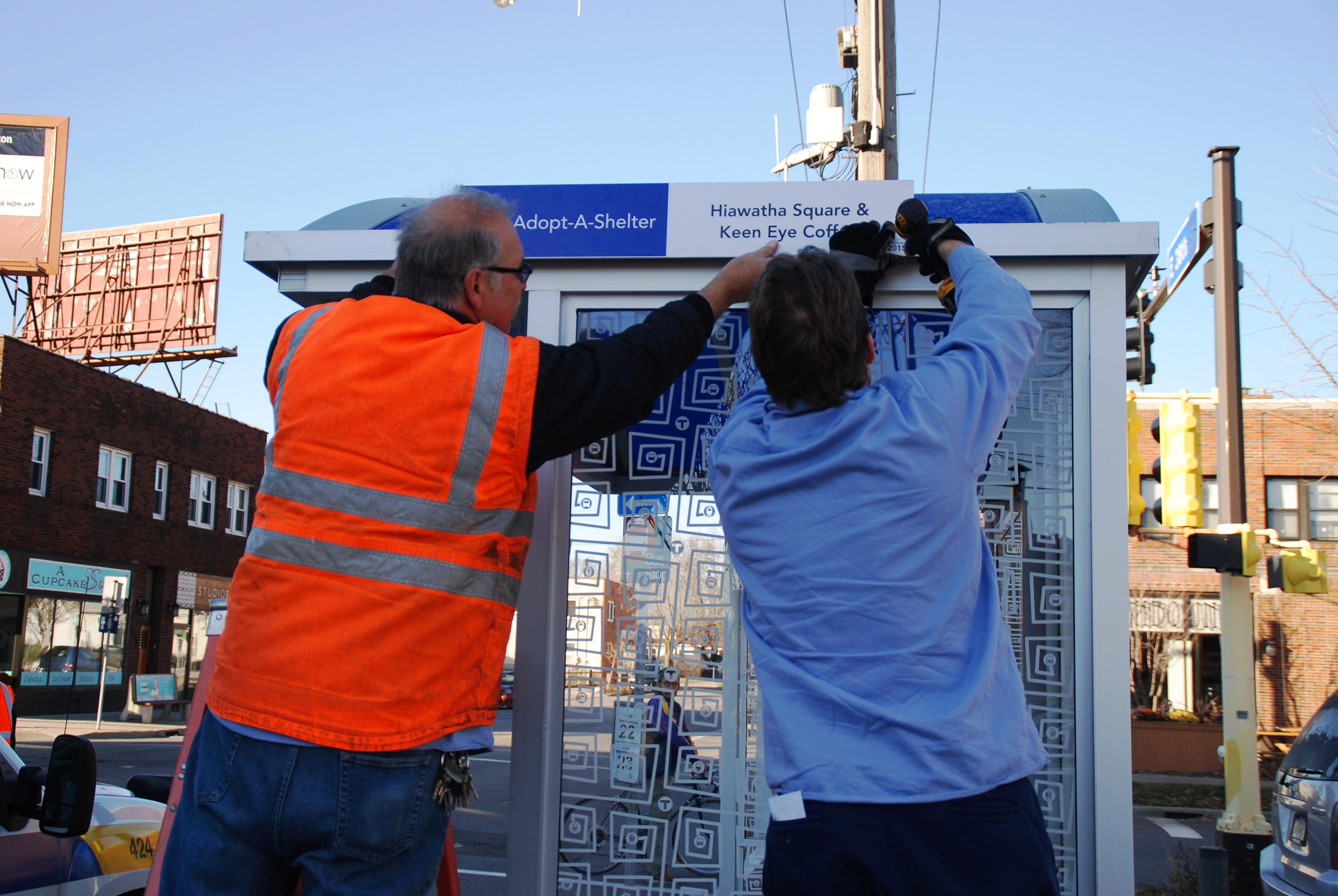 On a recent morning, Scurato and others who advocated for the new shelter celebrated that victory and watched as a sign noting its adoption was centered and fastened into place. The sign includes the names of Hiawatha Square, a nearby condo, and Keen Eye Coffee, which is located just across the street.