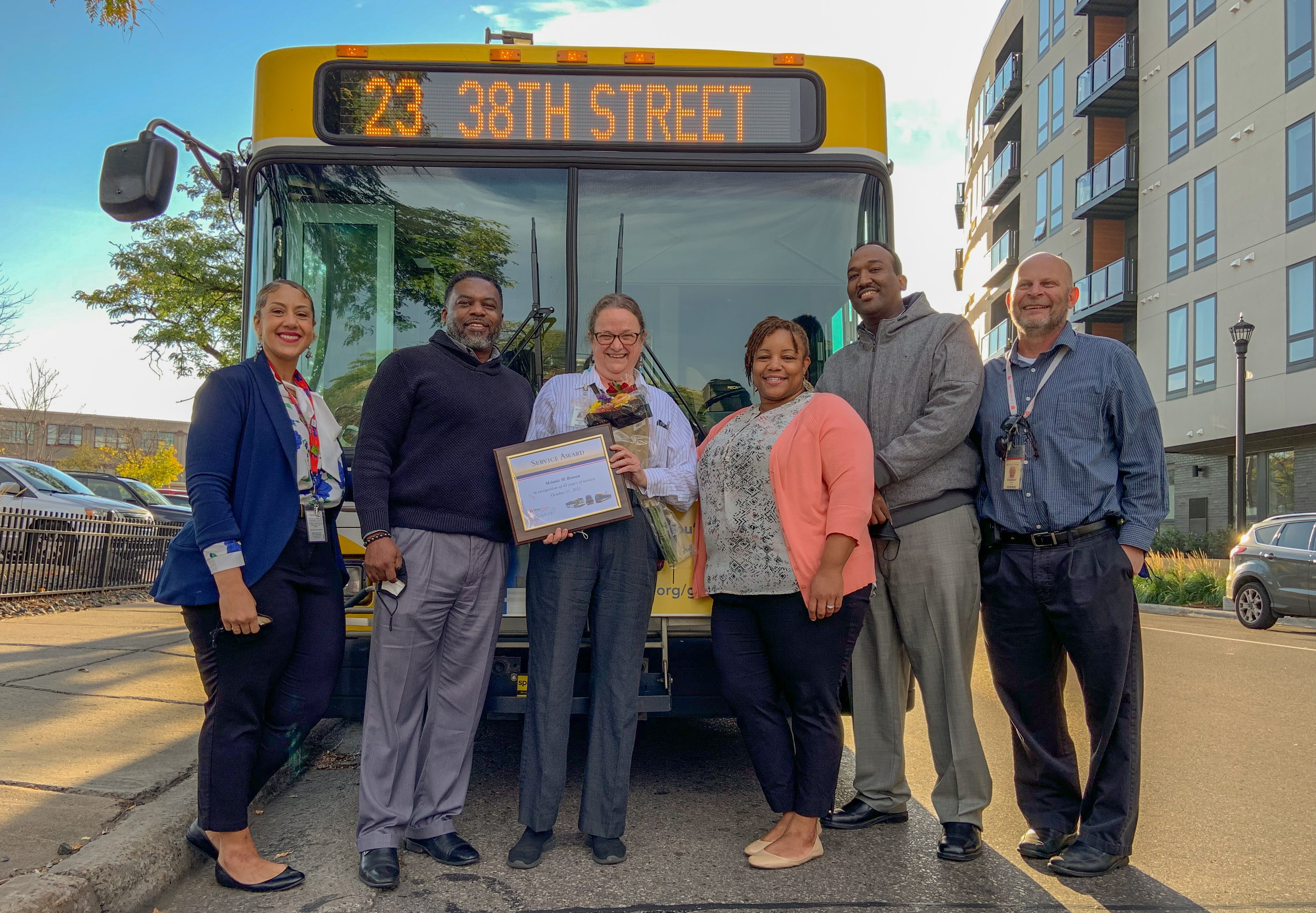 There was also a plaque to be presented, commemorating Benson’s 45 years of service at Metro Transit – many of them on Route 23, where she’s on a first-name basis with many regular riders. Benson’s career began on Oct. 11, 1976, soon after graduating from Macalester College and having an “epiphany” while waiting for a bus.