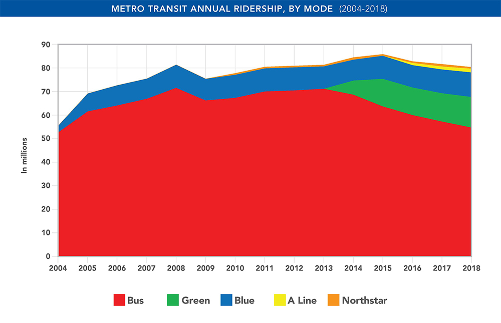 The decline in bus ridership largely reflects losses on Metro Transit’s busiest local routes, which will be substantially replaced and improved with Bus Rapid Transit service in the coming years.
