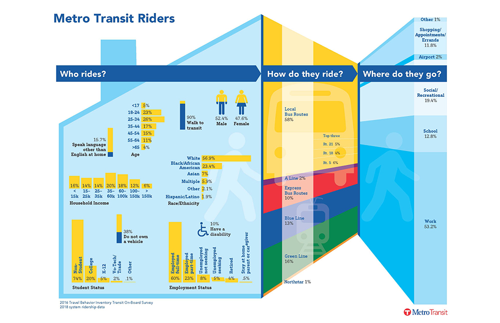 Across transit types and providers, nearly 94.2 million rides were provided in the seven-county region in 2018. That total includes suburban transit providers as well as the Metropolitan Council’s Metro Mobility, Transit Link and Vanpool services.