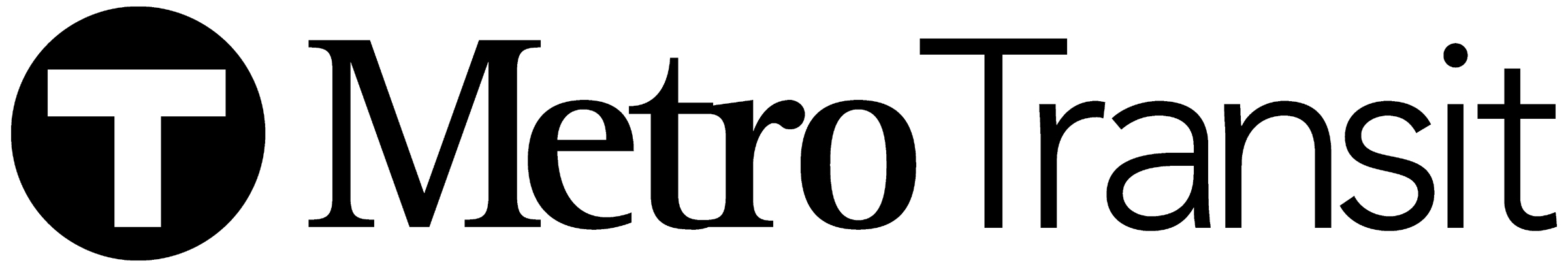 The logo is custom artwork and cannot be recreated using standard typestyles. Any printing, signage or product must be created using the custom artwork provided by Metro Transit. The Metro Transit logo should always be used in its entirety — the "circle T" with "Metro Transit" together. The "circle T" should not be used alone.