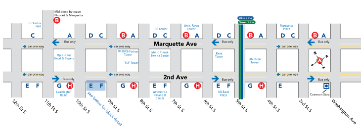 Buses stop every other block on Marq2. Simply remember the letter for your route and board the bus at any stops marked with that letter. Stops A, B, C and D are on Marquette Avenue. Stops E, F, G and H are on 2nd Avenue. Most blocks have two stops; each stop accommodates two buses. Arriving buses will pull into the first available space to board customers. You can board through all available doors and pay your fare as you exit the bus at your destination.