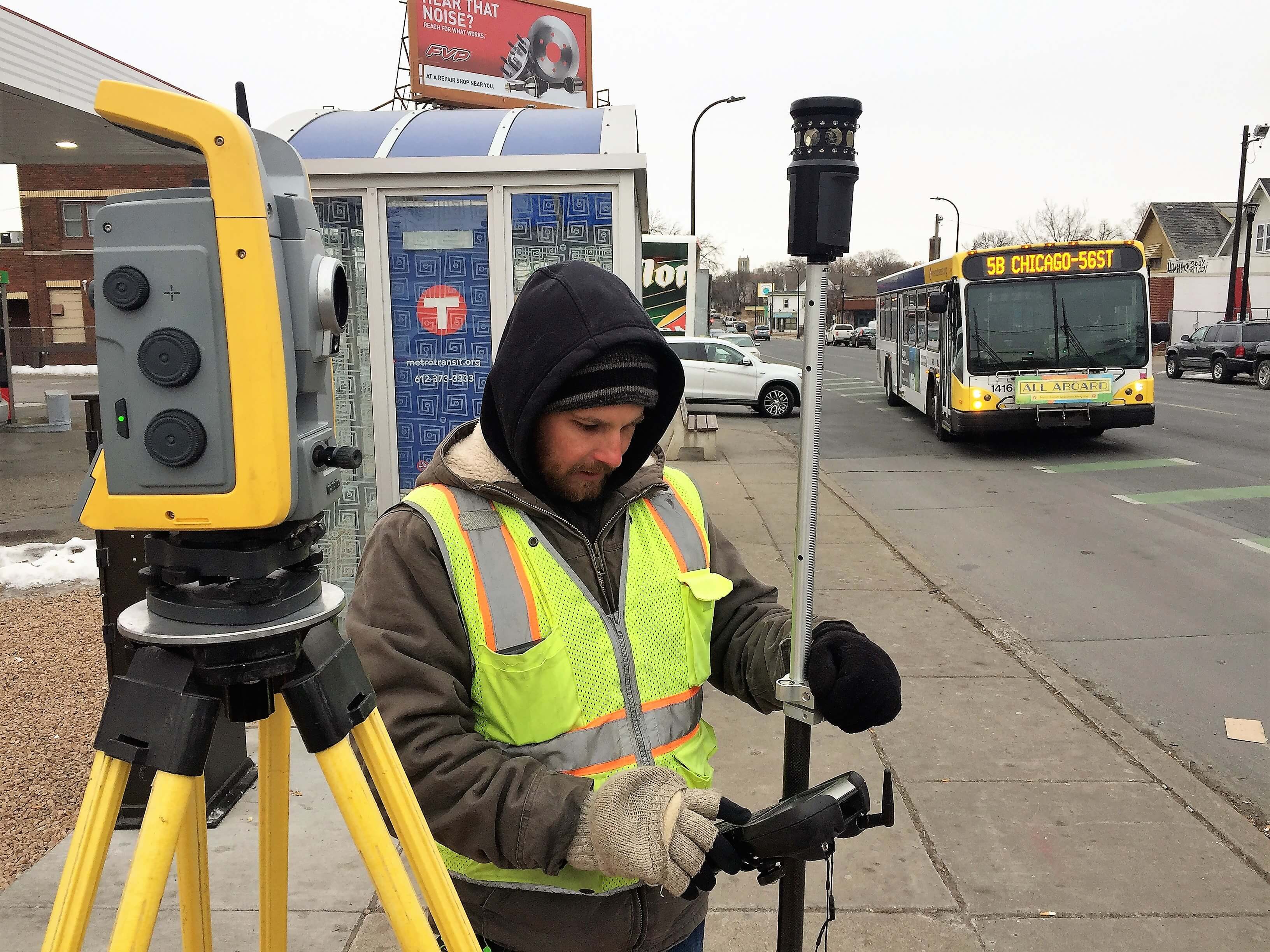 Jared Gazda takes a moment to setup his surveying equipment at the corner of 38th and Chicago in Minneapolis. The information he gathers will aid in station construction, including ADA compliance and drainage.