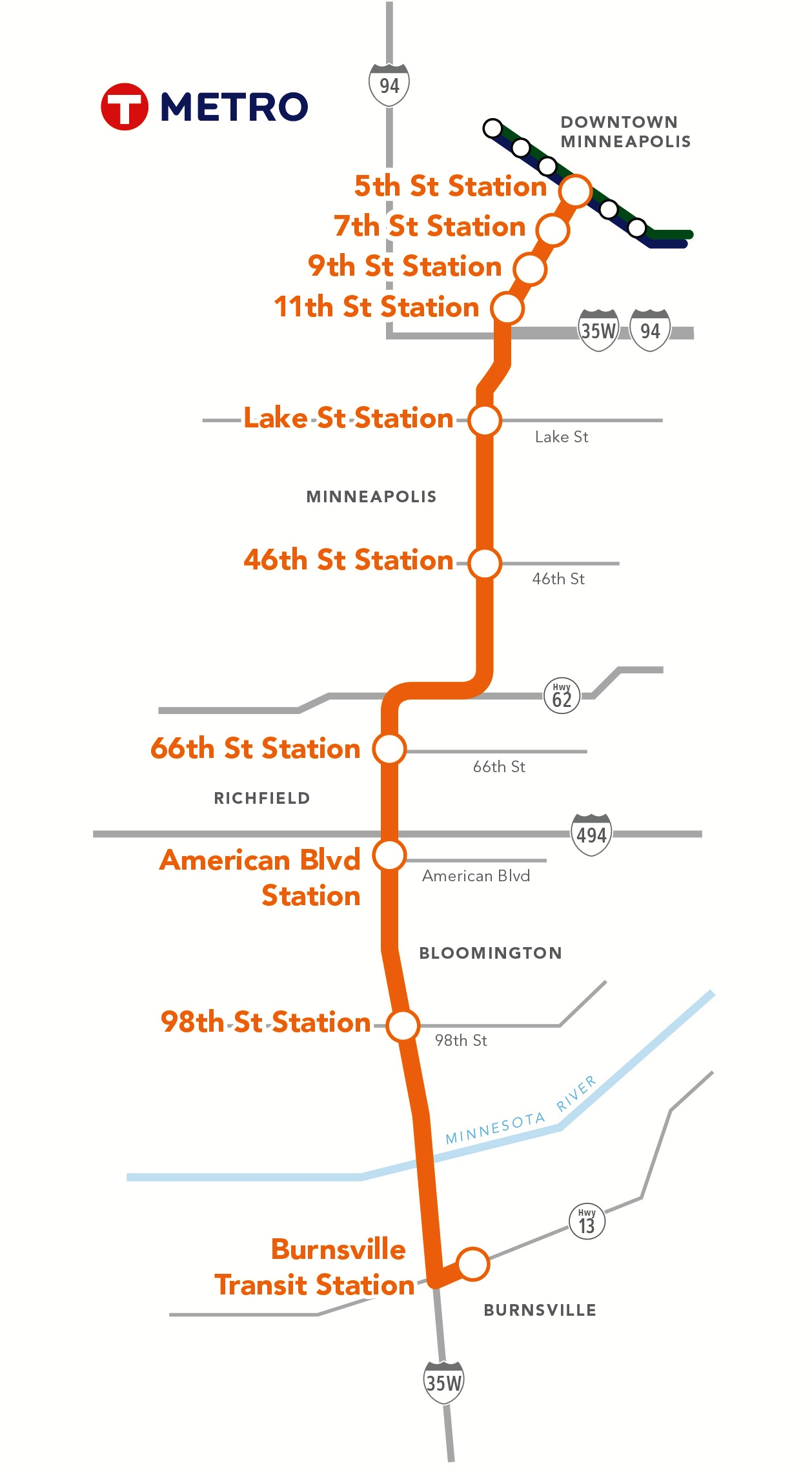 > Better station infrastructure. Like other METRO lines, Orange Line stations will be more comfortable and accessible -- with on-demand heat, ticket machines, enhanced transit information (including real-time, NexTrip signs) and security features. These stations will not only serve the Orange Line but complementary local and express routes, making transfers easier and more efficient. At the border of Richfield and Bloomington, Orange Line stations on Knox Avenue are also being incorporated into redevelopment plans that will create a more transit-, pedestrian- and bike-friendly environment.