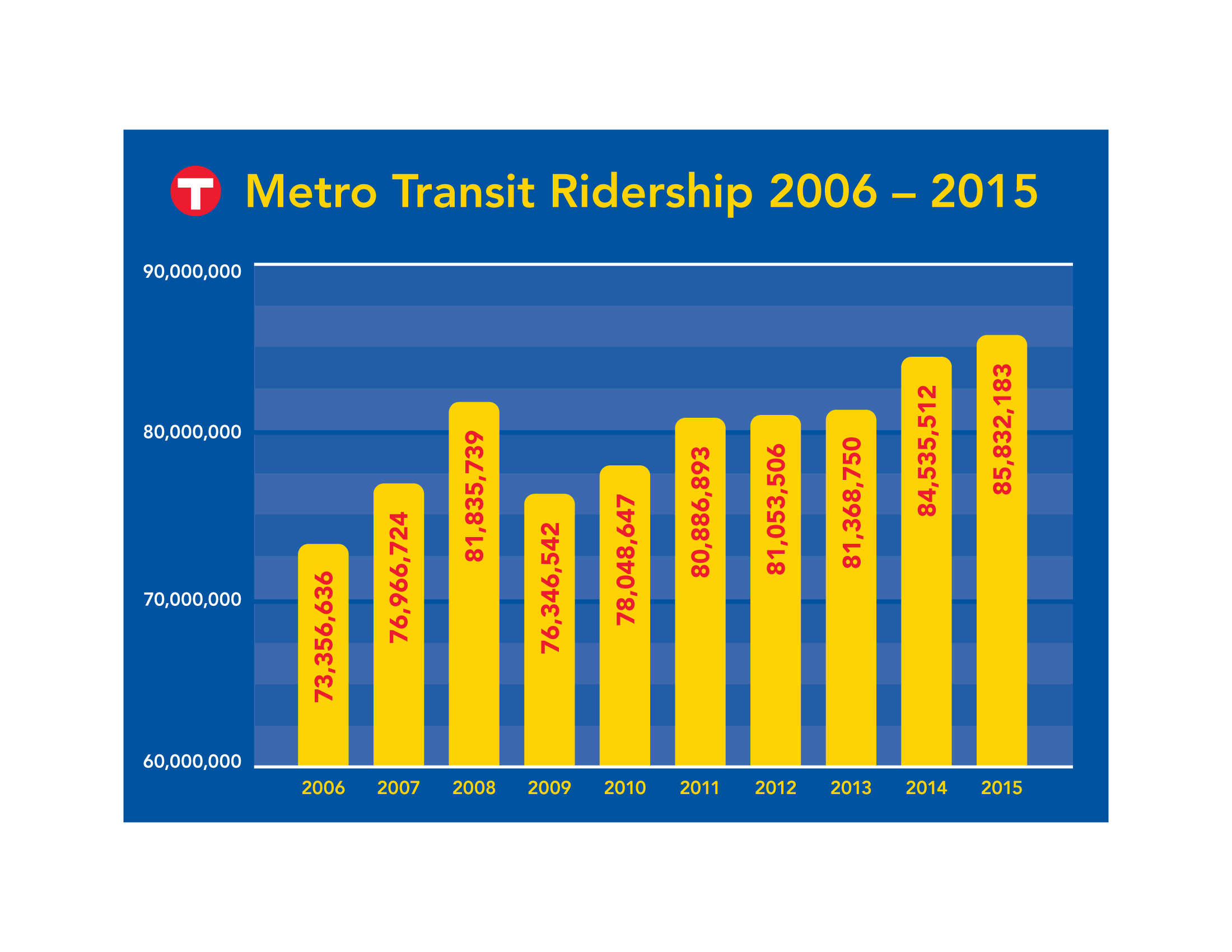 The METRO Blue Line set a new annual ridership record and system ridership increased for the 11th time in 12 years as customers took more than 85.8 million rides on buses and trains operated by Metro Transit in 2015.