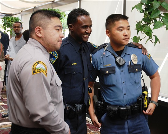 Top left: Abdulkhayr Hirse poses with St. Paul and Minneapolis police officers prior to the Metro Transit Police Department's swearing in ceremony on Friday. Bottom right: Salah Ahmed poses with an officer from the Dakota County Sheriff Department on Friday.