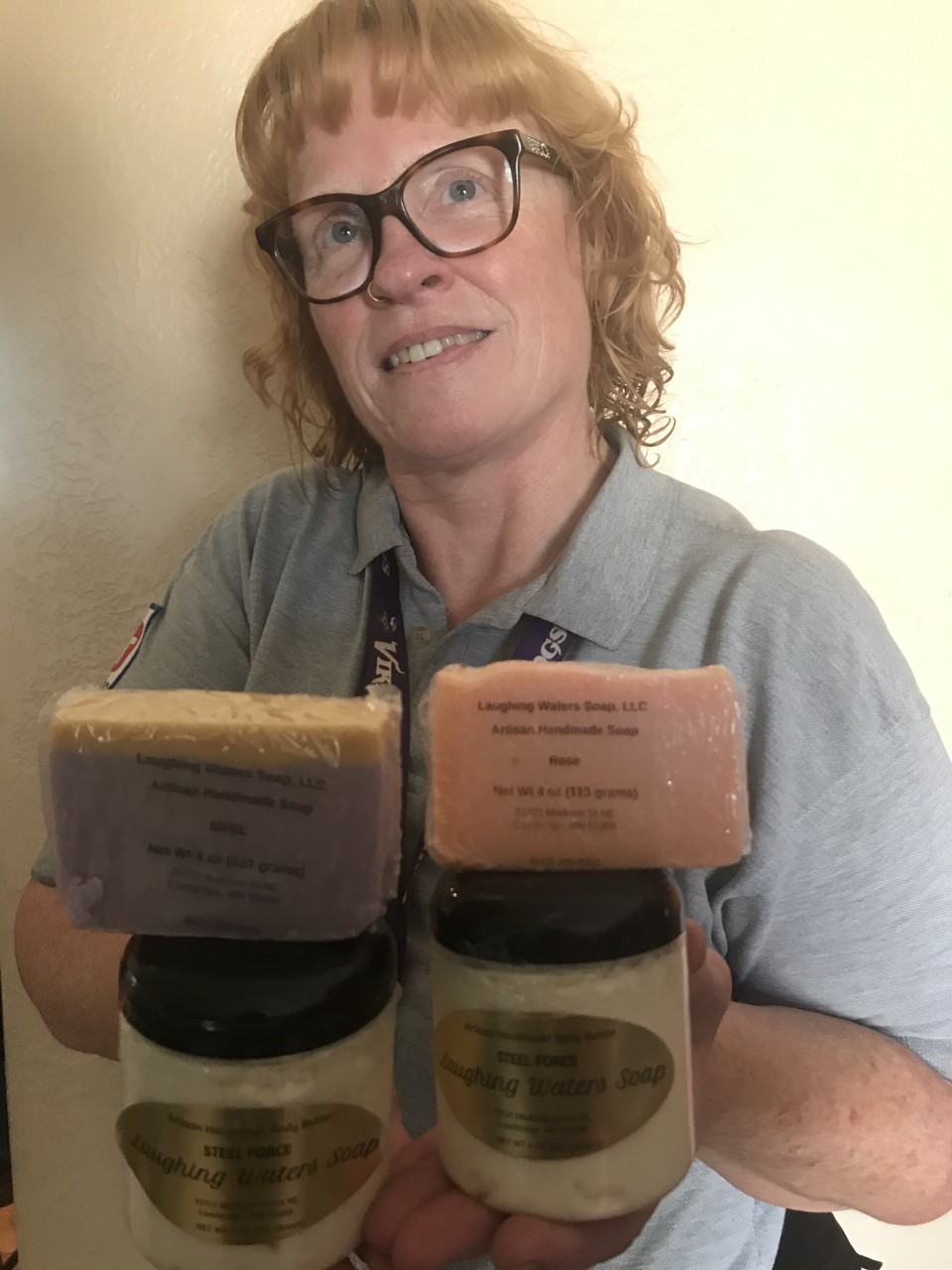 When I’m not steering a bus, I am stirring up batches of natural soaps and body butters. I first started making my own soaps years ago out of necessity. I have hypersensitive skin that goes with being a redhead and had difficulty finding commercial skin care products that weren’t irritating. Today, my sisters and I make soaps under the name Laughing Waters Soap & Skin Care in a studio in Cambridge. I envision turning the skin care line into a post-retirement job. But, I really enjoy my job, so I’m in no hurry to retire.