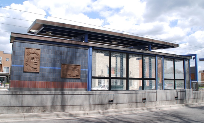 Public art: Minneapolis artist Foster Willey partnered with his brother Guy to sculpt portraits of historic people and landmarks from the Rondo community which are affixed to the station walls. Around 80 individuals were nominated for inclusion in the “Faces of Rondo” project and community members helped select 17 people to include. Among those featured at the station is Gordon Parks, who overcame trying circumstances to become a well-regarded author, photographer and filmmaker. Others featured at the station are Pearla Mae Barnes, Lou Bellamy, Dorothea Burns, Charles Crutchfield Sr., Mahmoud El-Kati, Beverley Oliver Hawkins, Katie McWatt, Debbie Montgomery, Rhoda Stroud, Billy Williams, Floyd Massey Jr., Sharon Sayles Belton, Tiger Jack Rosenblum, Hallie Q. Brown and Evelyn Fairbanks. There are also images of the Rondo-Stryker streetcar, a familiar sight in the neighborhood from the 1920s to the 1950s; Mechanic Arts High School, a fixture in the community until it closed in 1976; and Pullman porters. Many early African American Rondo residents worked on sleeping cars as Pullman porters, and fromed the first all-black union. Learn more.