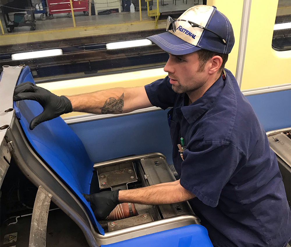 Electro-Mechanical Technician Chris Kostohris recently installed new plastic seats on a light rail vehicle at the Blue Line Operations & Maintenance Facility in Minneapolis.