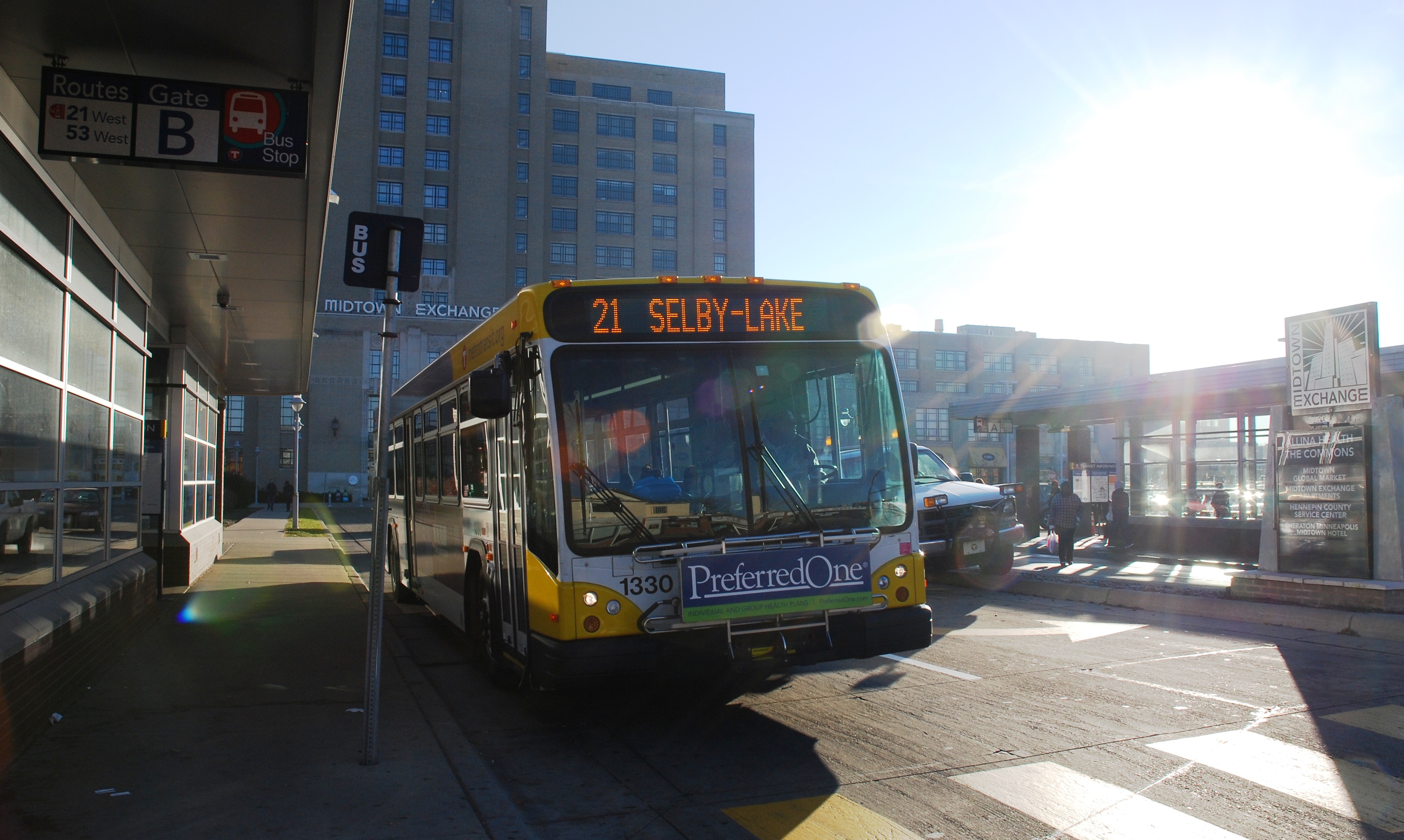Service: Route 21 runs between the Uptown Transit Station on Hennepin Avenue and the Union Depot in downtown St. Paul. In Minneapolis, buses run on Lake Street, stopping at I-35W and Lake Street, the Chicago Lake Transit Center and the METRO Blue Line’s Lake Street/Midtown Station. After crossing the Mississippi River on the Lake Street bridge, Route 21 buses continue on Marshall Avenue, north to University Avenue via Snelling and Hamline Avenues, then east on Selby Avenue to downtown St. Paul. The section of Route 21 between Hennepin Avenue and the Mississippi River is part of Metro Transit’s Hi Frequency Network in which buses operate at least every 15 minutes weekdays from 6 a.m. to 7 p.m. and on Saturday’s from 9 a.m. to 6 p.m. Route 21 operates between approximately 4 a.m. and 2 a.m. An end-to-end trip is scheduled to take just under an hour. Destinations on the Route 21 corridor in Minneapolis include Uptown, the Midtown Exchange Building, Powderhorn Park and South High. The route parallels the Midtown Greenway, which sits just north of Lake Street. In St. Paul, destinations include the University of St. Thomas (served by Route 21’s D branch), the Midway Shopping Center, Concordia University and St. Paul College. Route 53 runs a similar course as Route 21 between the Uptown Transit Station and downtown St. Paul, providing limited stop service during peak hours.