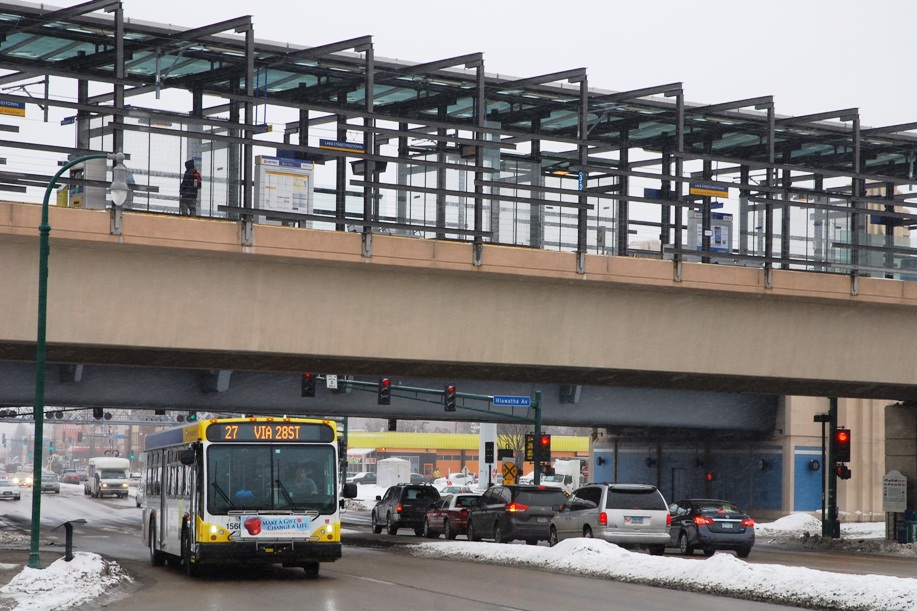 While Oliver was traveling eastbound on Route 27, the route is also a strong link for those traveling west from the Blue Line. From Lake Street/Midtown Station, Route 27 buses travel east on Lake Street then venture north on Cedar Avenue to East 26th Street en route to Interstate 35W. Buses return to the Blue Line via East 28th Street.