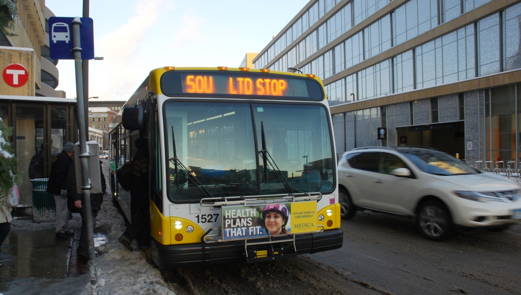 After riding express Route 785 to downtown Minneapolis, Vanhee caught a Route 50 bus that took him across the Washington Avenue Bridge to Jones Hall, a longer but much more efficient leg of his morning commute.