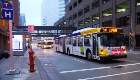 Service: Route 597 runs along the Interstate 35W corridor providing express bus service between downtown Minneapolis and Bloomington. Buses operate between approximately 6 a.m. and 6:30 p.m. on weekdays. There are several Park & Rides along the route, including Normandale Village, Transfiguration Lutheran Church, St. Luke’s Lutheran Church and the South Bloomington Transit Center. Route 597 also provides limited service to the I-35W and 46th Street Station, which opened in 2010 and sits between the northbound and southbound lanes of I-35W. Downtown, Route 597 buses use the Marq2 transit corridor, where NexTrip signage, heated shelters and wider sidewalks have been added to improve the customer experience. Route 597 is Pay Exit bus in which customers pay at the end of their trip to speed boarding on buses leaving downtown during rush hours. Route 597 serves as a complement to Route 535, which also travels along the I-35W corridor providing limited-stop service at 15- to 60-minute intervals on weekdays.