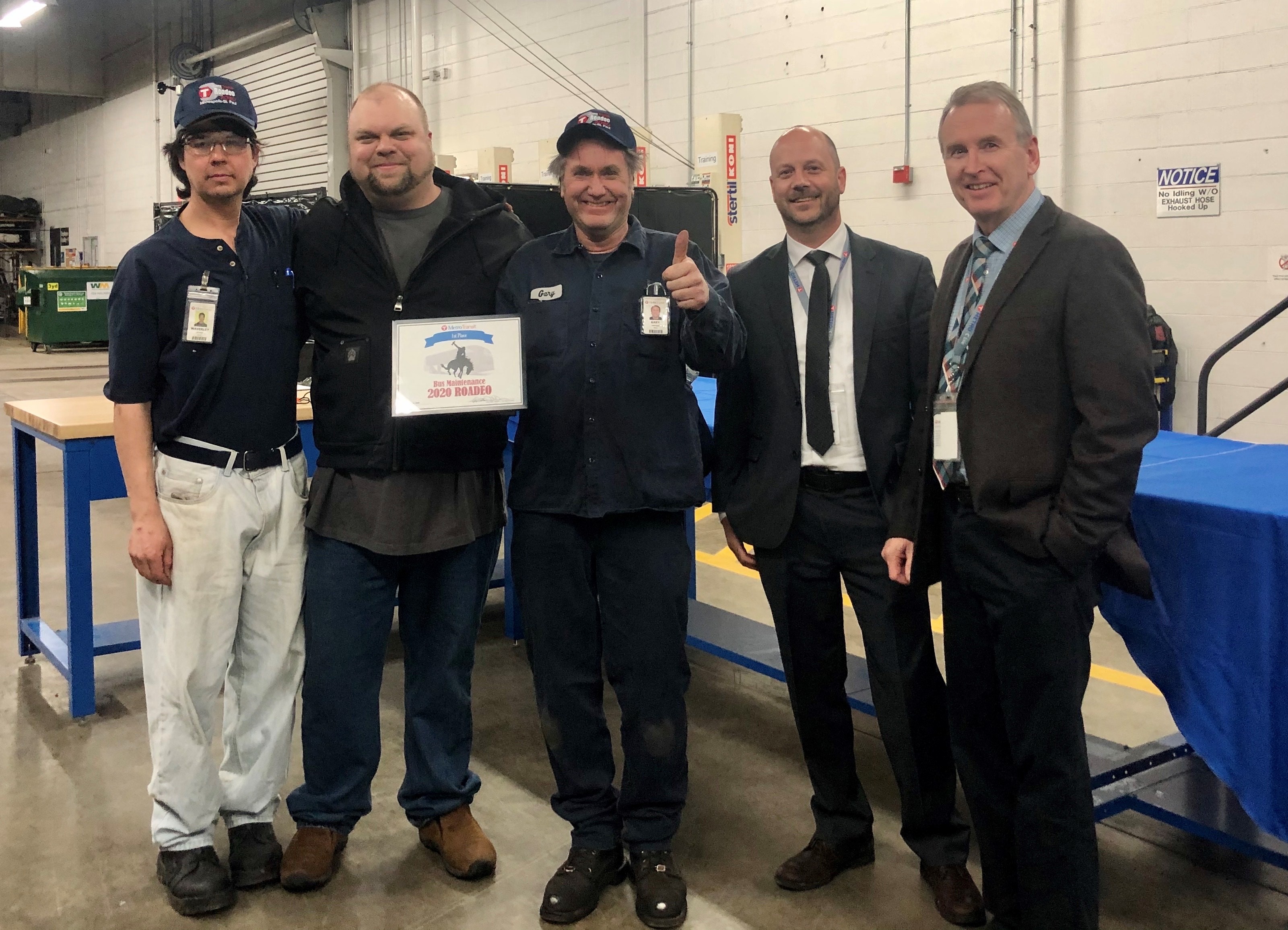 Trent Devries, Chris Antholz and Gary Gauthier celebrate their victory with Matthew Dake, director of bus maintenance, and Mike Joyce, assistant director of bus maintenance.