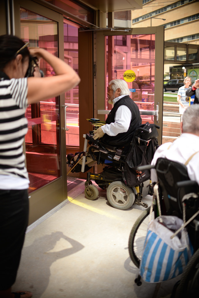The first person to take the trip up the tower: Rick Cardenas, who advocated on behalf of the disability community to make the case for its construction.