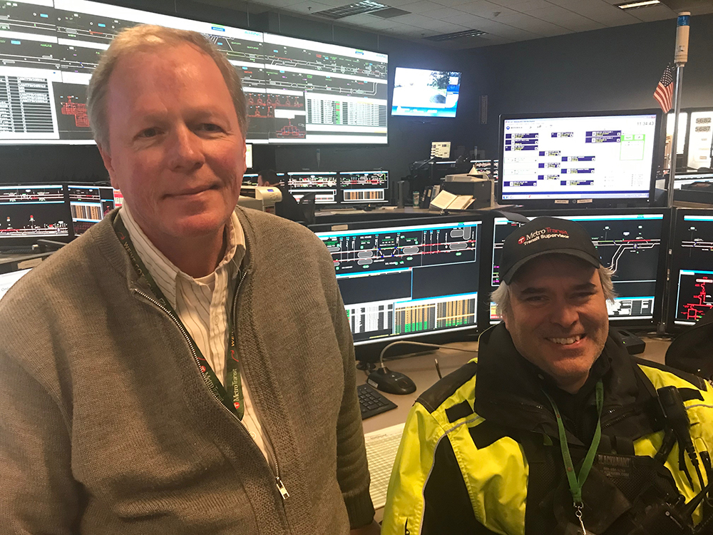 From the Rail Control Center, Rail Supervisor Jim Clancy (above right) called 911 as Peach and a bystander removed the man’s backpack to lay him on his back.