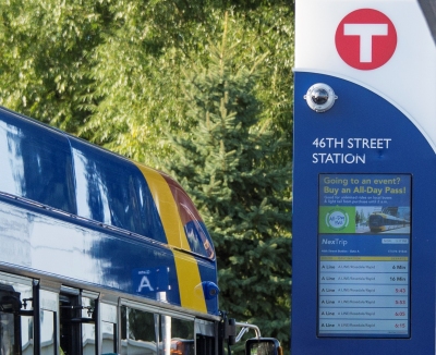 METRO BRT stations provide our customers with real-time information, so you’ll always know when the next bus is coming. Some stations also alert our customers when a bus is about to approach by a pulsing light behind our iconic T logo at the station. These stations also have heat, security cameras, and snow removal services.