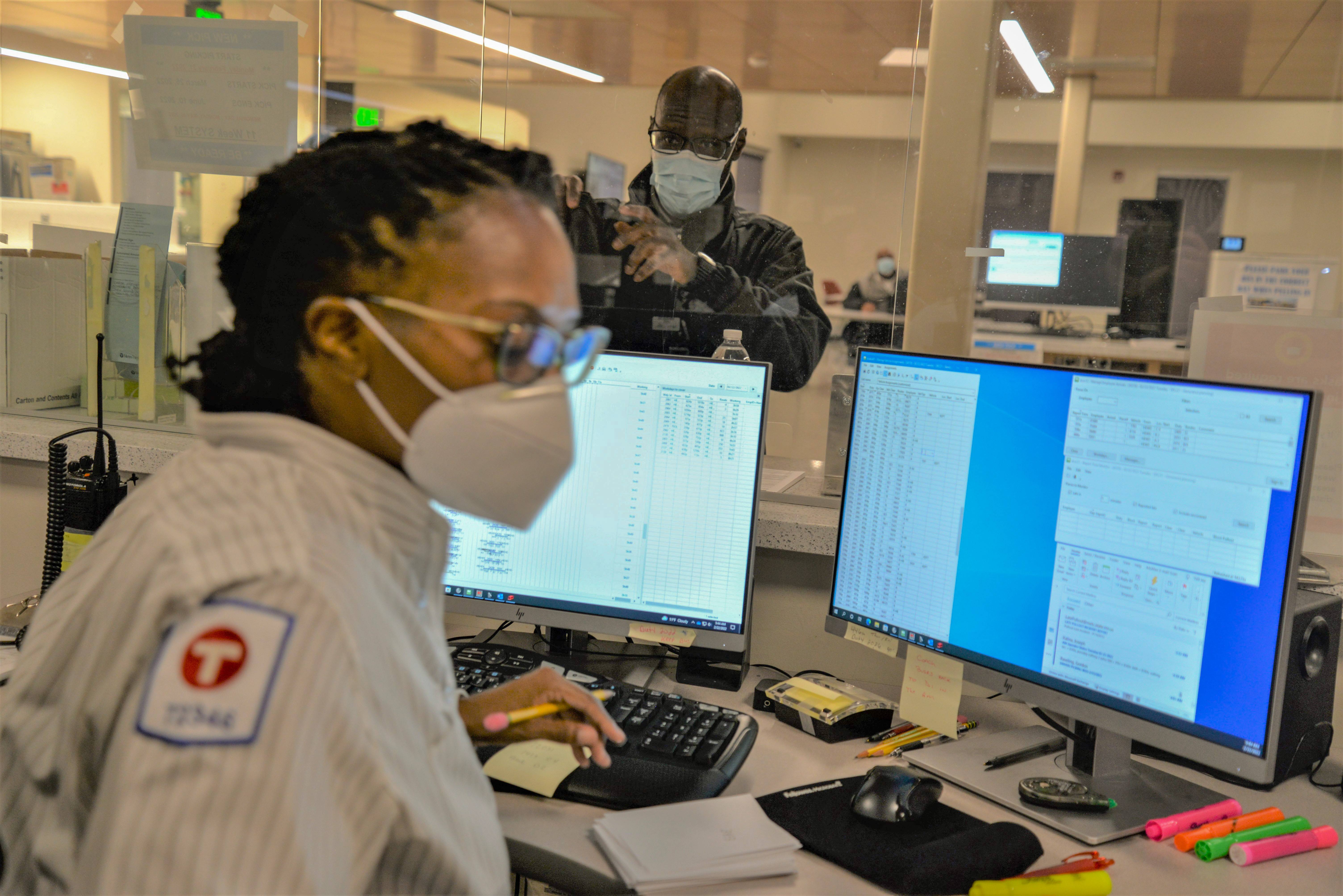 Dispatchers Allen Juaire and Lasondra Gosa work to fill work from routes to trips throughout the day. They’re responsible for about 200 buses and about 450 pieces of work. Operators get their bus number and route assignments from them. Gosa is finishing up her overnight shift and Juaire is starting his. Gosa is a relief dispatcher and a bus operator.