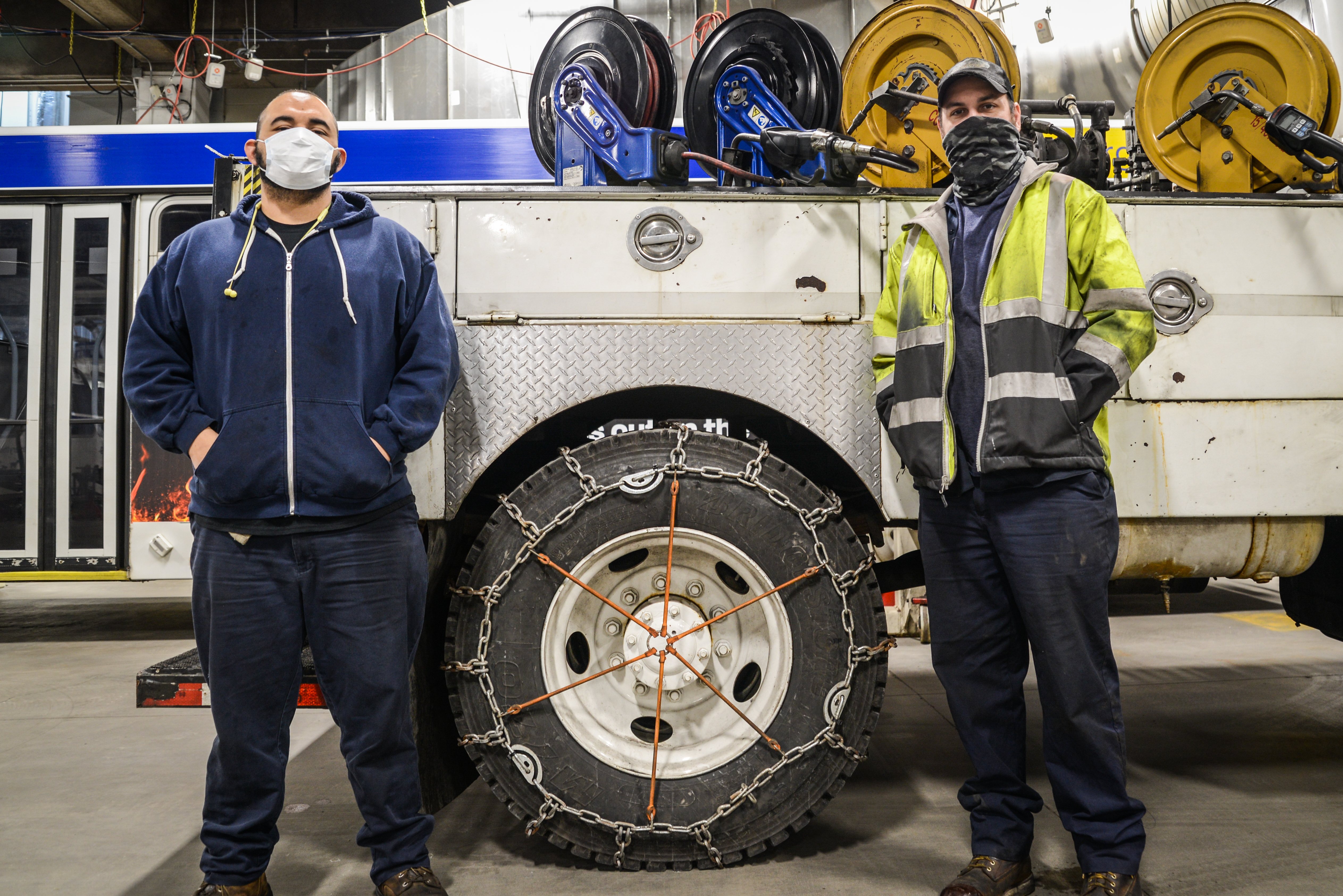 At St. Paul’s East Metro Garage, technicians Rafael Valle (left) & Taylor Schoephoerster (right) were on standby to help retrieve any buses that got stuck in the snow. Hillier St. Paul becomes particularly difficult to traverse when roads are covered in snow but, on this day, just three buses got stuck and needed to be towed.
