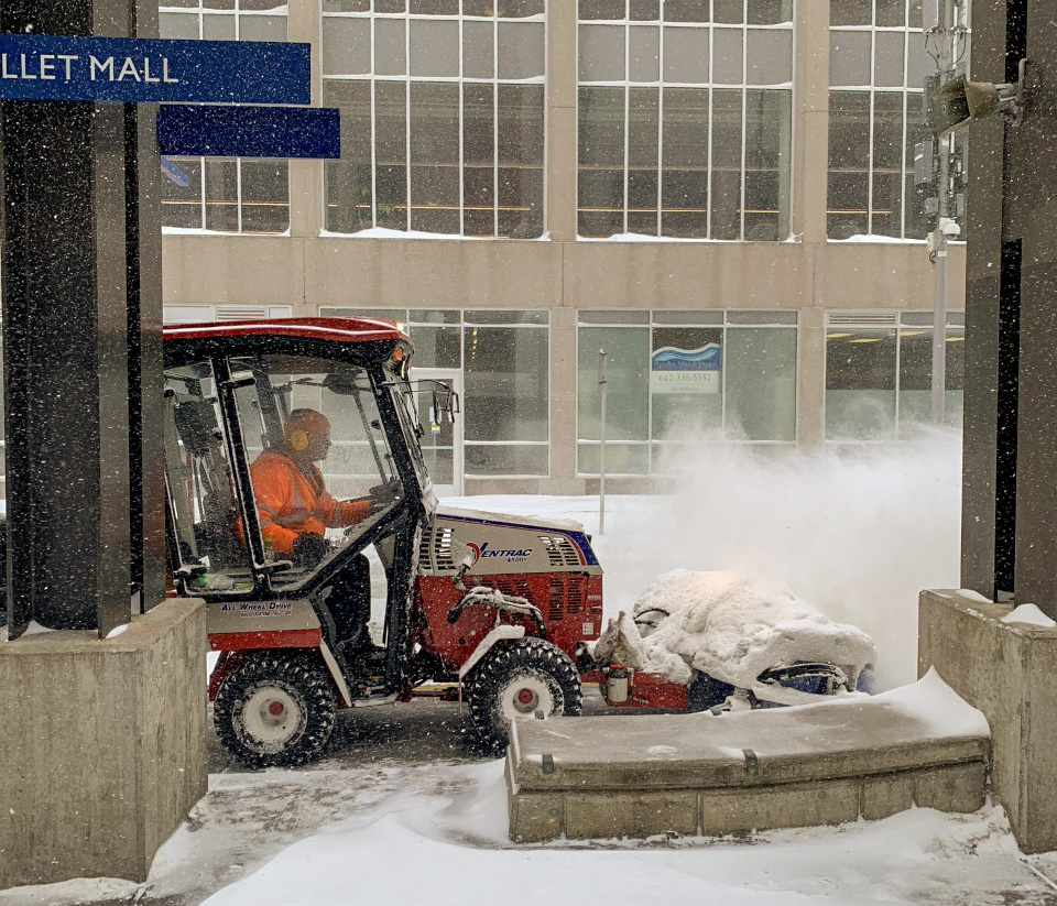 By early Tuesday afternoon, facilities maintenance crews were out at light rail stations clearing snow from platforms, efforts that would continue into the evening. Rail stations, bus garages, and other support facilities where employees report to work are prioritized when it snows. Facilities staff return later to other sites, including transit centers and shelters that are used by customers with limited mobility.