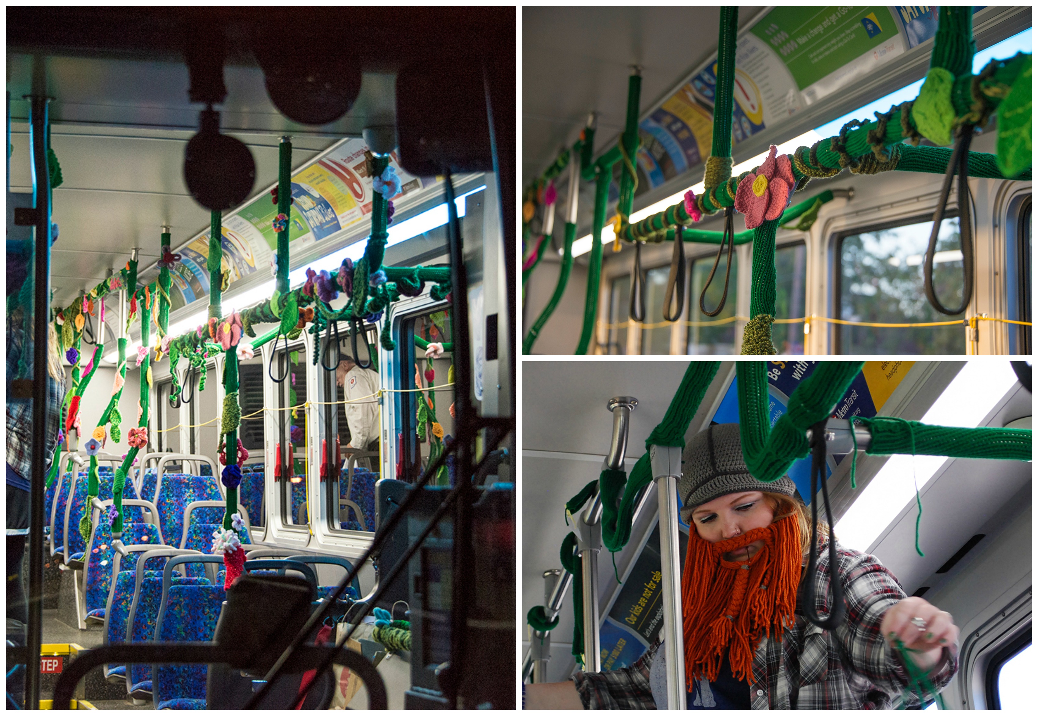 Christened the “Yarn Bus,” handrails are wrapped in green yarn and dotted with a colorful array of knitted leaves, flowers, mushrooms and vines that give the bus a forested feel.